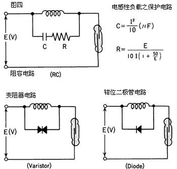 當將干簧管用于感性負載,例如電動機÷繼電器線圈、螺線管等,其觸點在(負載電路)觸點開路時將加有高感生電壓。這種(瞬態)高感生電壓可能會損害干簧管或者明顯地降低干簧管地壽命。因此建議采用保護電路,例如阻容(吸收)電路、變阻器或鉗位二極管電路(見圖四)。