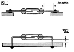 當在PCB板上安裝干簧管時,建議形成引線角并在PCB板與干簧管之間留下適當空間,或者將干簧管插入PCB板種的開口(切口)種(見圖三)