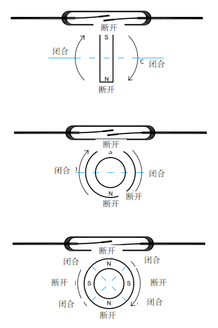 于常開模式下,當有磁鐵靠近干簧開關時(反之亦然)干簧片就會關閉,將磁鐵移開后干簧片就會重新打開。于常閉模式下,當有磁鐵靠近磁簧開關時干簧片就會打開,將磁鐵移開后干簧片就會重新關閉。于保持模式上,干簧片可能是在常開或常閉兩種狀態,當有磁鐵靠近干簧管時干簧片就會改變它們的形態,如果起初的形態是打開,現在就會關閉,當磁鐵移開后干簧片仍會保持關閉,這時將改變了磁極性的磁鐵再靠近時干簧片才會打開,將磁鐵移走后干簧片仍會保持打開。此時再將磁鐵的磁極反轉并靠近干簧管時開關會再次關閉,而磁鐵移開后仍保持關閉,于這情況下一個是保持模式傳感器或是雙穩態傳感器。