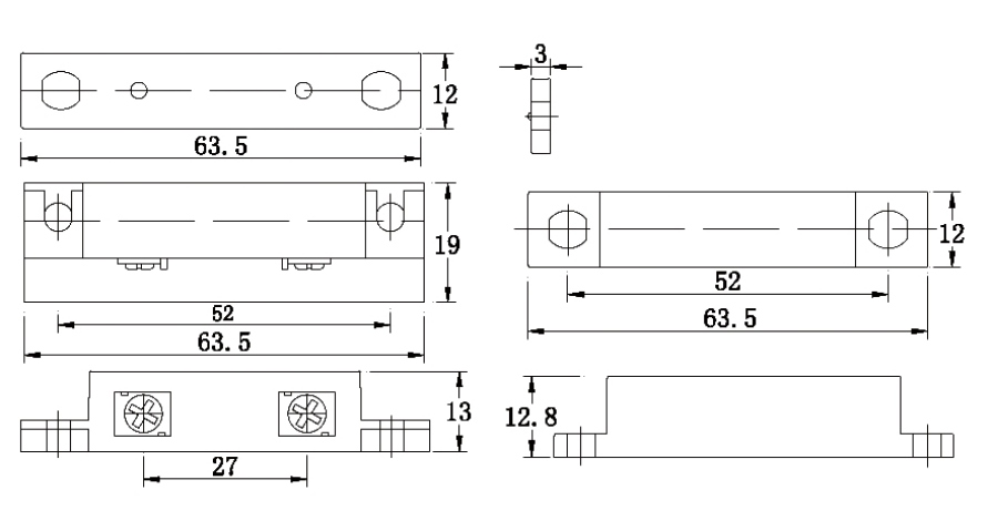 4)、在安裝過程中,表面貼裝時干簧管的觸點位置與磁鐵的磁力線最高點一定要平行安裝;但在嵌入式暗裝時,磁鐵和干簧管兩部份要相向平行在一條線上,這樣才可以取得最佳的感應距離。且兩部份最好無間隙安裝,間距越小越好,最大間隙不應超過5mm(卷簾門除外)。如果錯位安裝將導致啟動感應距離的縮短,甚至感應不到任何信號的時候,就會導至開關失靈。